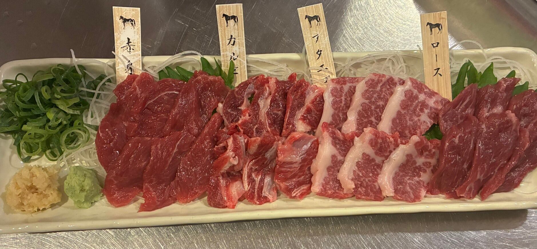 馬刺しの定番の【赤身】と、脂の旨味がたまらない【カルビ】と、紅白の見た目が美しい【フタエゴ】と柔らかさ満開の【ロース】と【馬刺し専用タレ】がセットになっています。